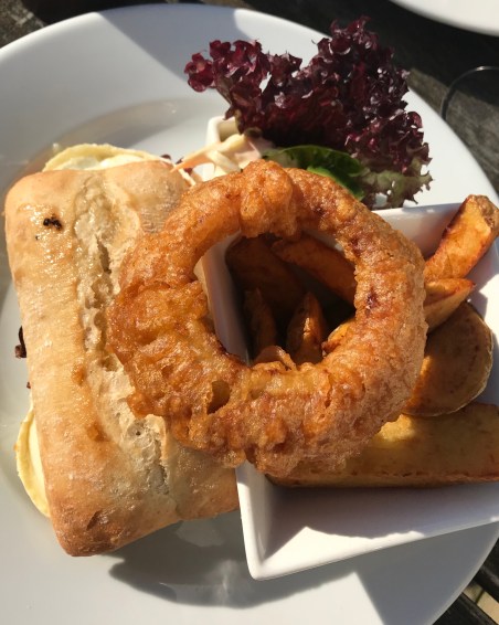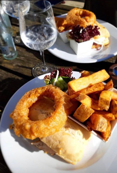 We settled on ordering a sandwich each, trying the cajun chicken & mozzarella that comes with jalepino jam, and the goats cheese with caramalised onion jam. Both were served on toasted ciabata and came with homemade chunky chips, coleslaw, and a huge ale-battered onion ring. Lunch is served as large but very satisfying portions that looked and tasted fantastic! A few gin & tonics later, we started our 6 mile walk home, but we both said we wanted to go back to this lovely little pub for either an evening meal or a Sunday Roast one day.