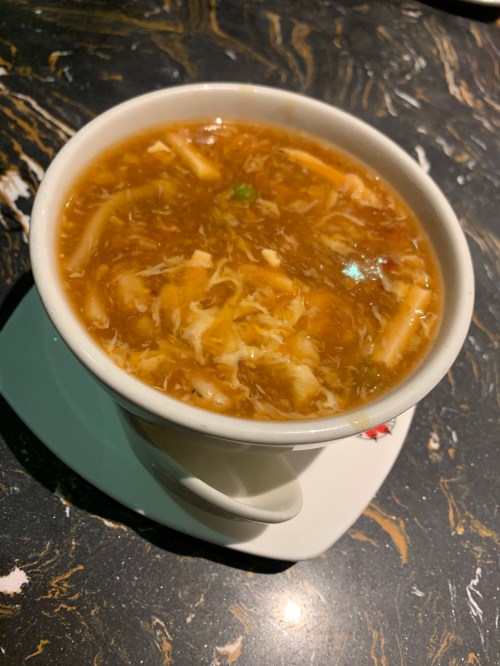 So the first course was a choice of Hot & Sour or Chicken & Sweetcorn Soup – we went for the Hot & Sour as I really enjoy this soup and my friend had never tried it before. We both loved it and we were given a large portion filled with lots of ham and prawns and the usual vegetables etc that you would expect.
