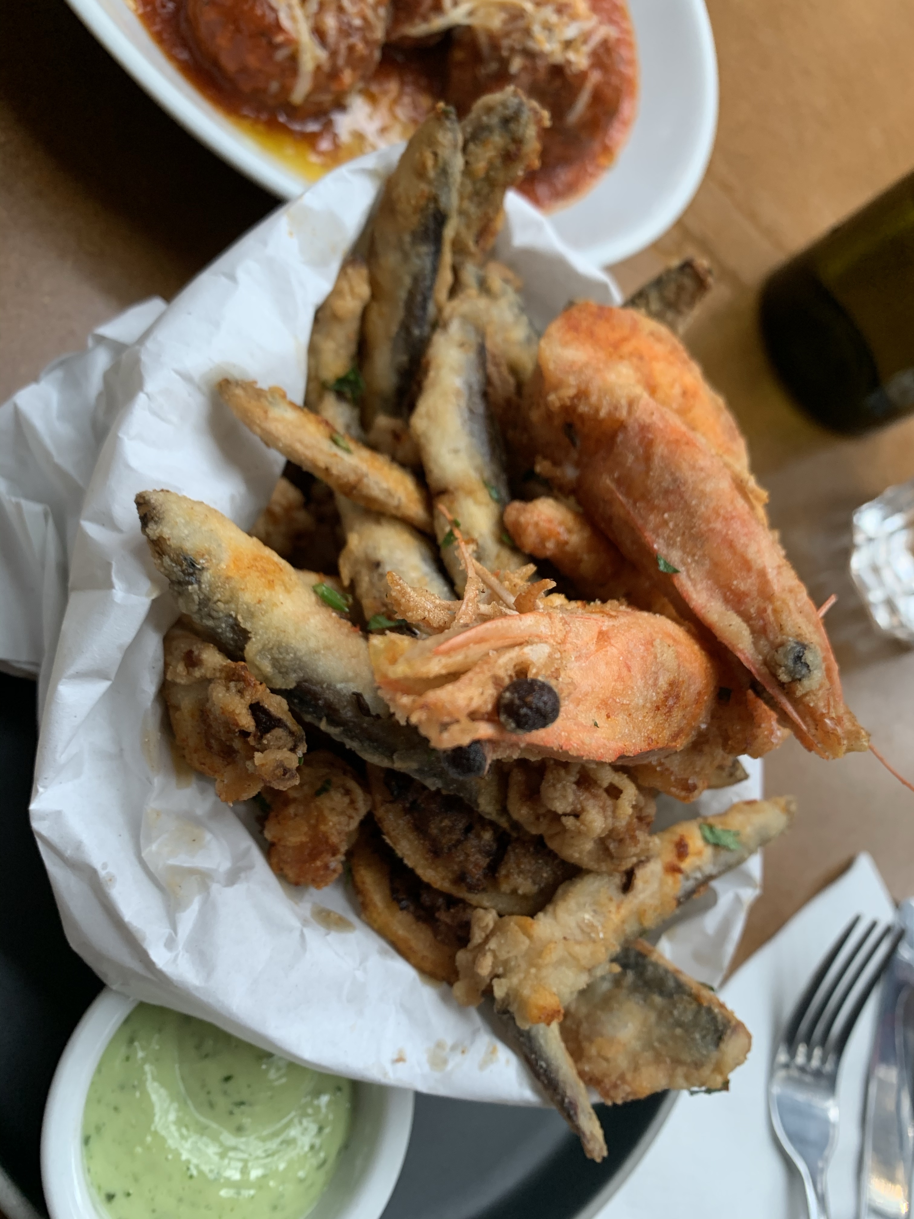 Fritto Misto – Deep fried selection of seafood served with lemon and caper aioli. This was a large portion and was absolutely delightful! Lots of large whitebait, 2 king prawns, and mini bits of calamari all deep fried. The whitebait was great, we’d never seen such big ones! The prawns were so juicy and tasty it’s a shame there was just 2. I have to say the calamari was lacking a bit, we had a lot of just bits of batter, but never mind as we enjoyed the rest so much, it was the only dish we couldn’t finish.