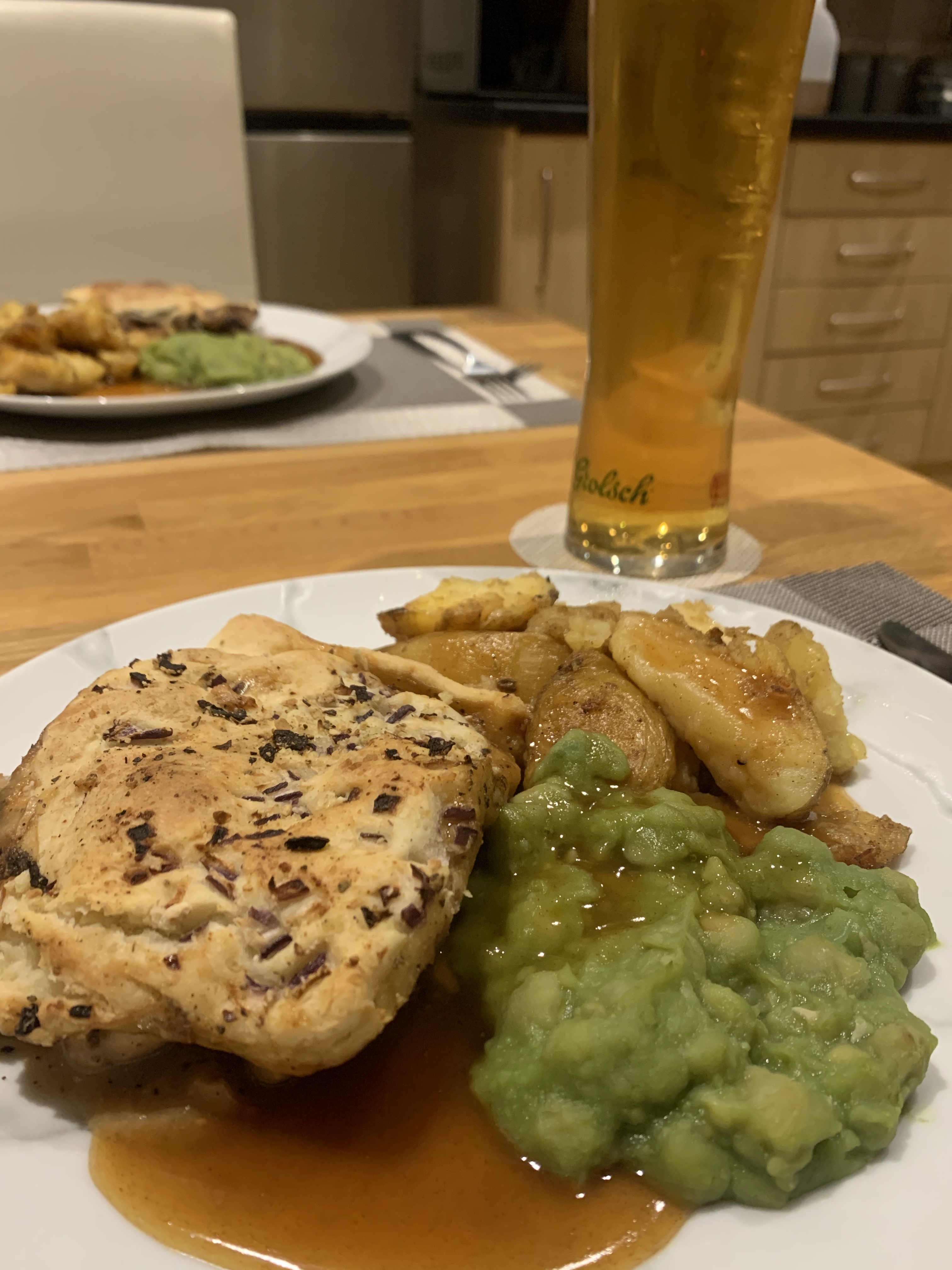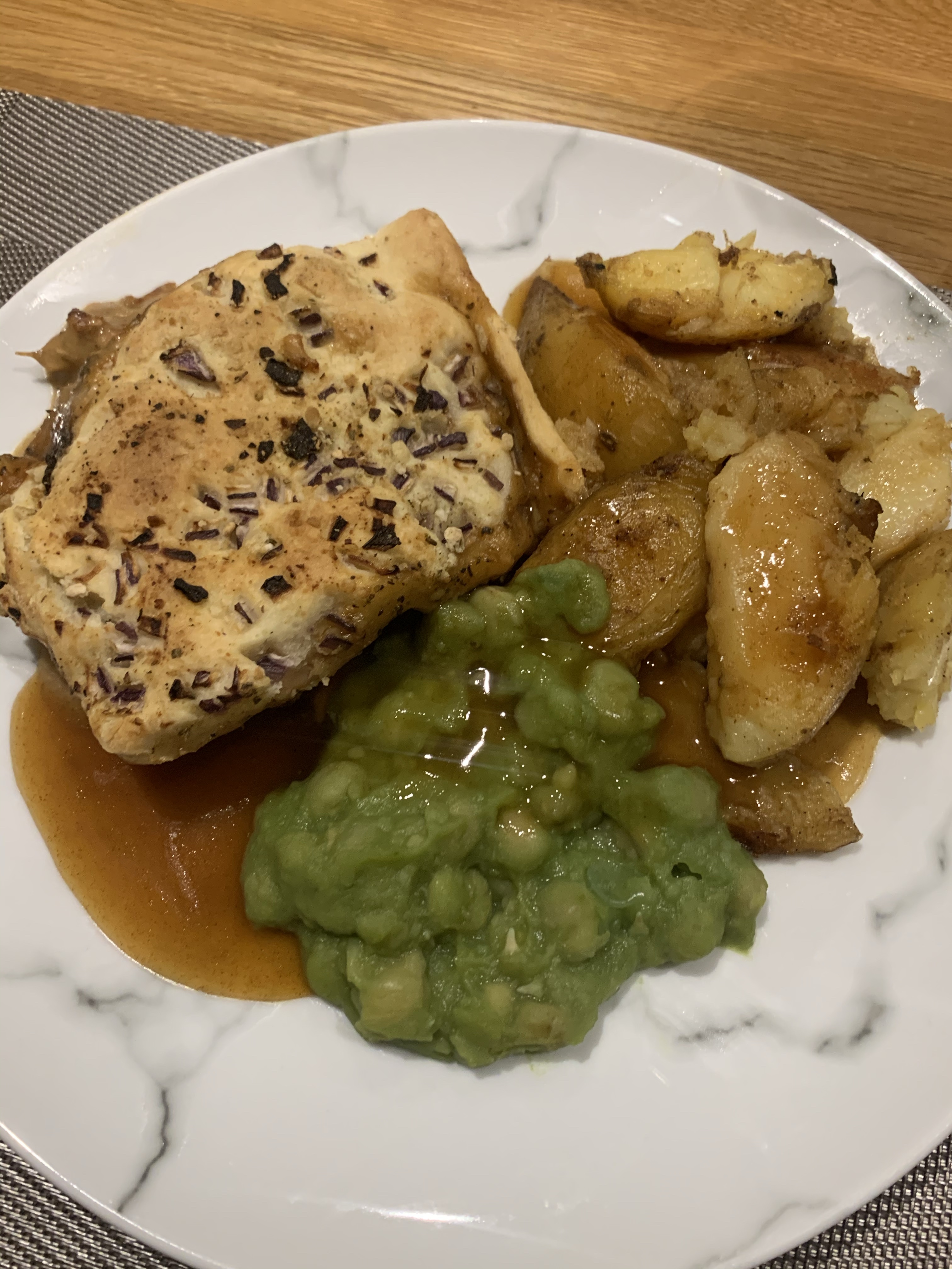 Both pies came with LOTS of homemade potato wedges – lovely jubbly. And a portion of mushy peas & gracy each.