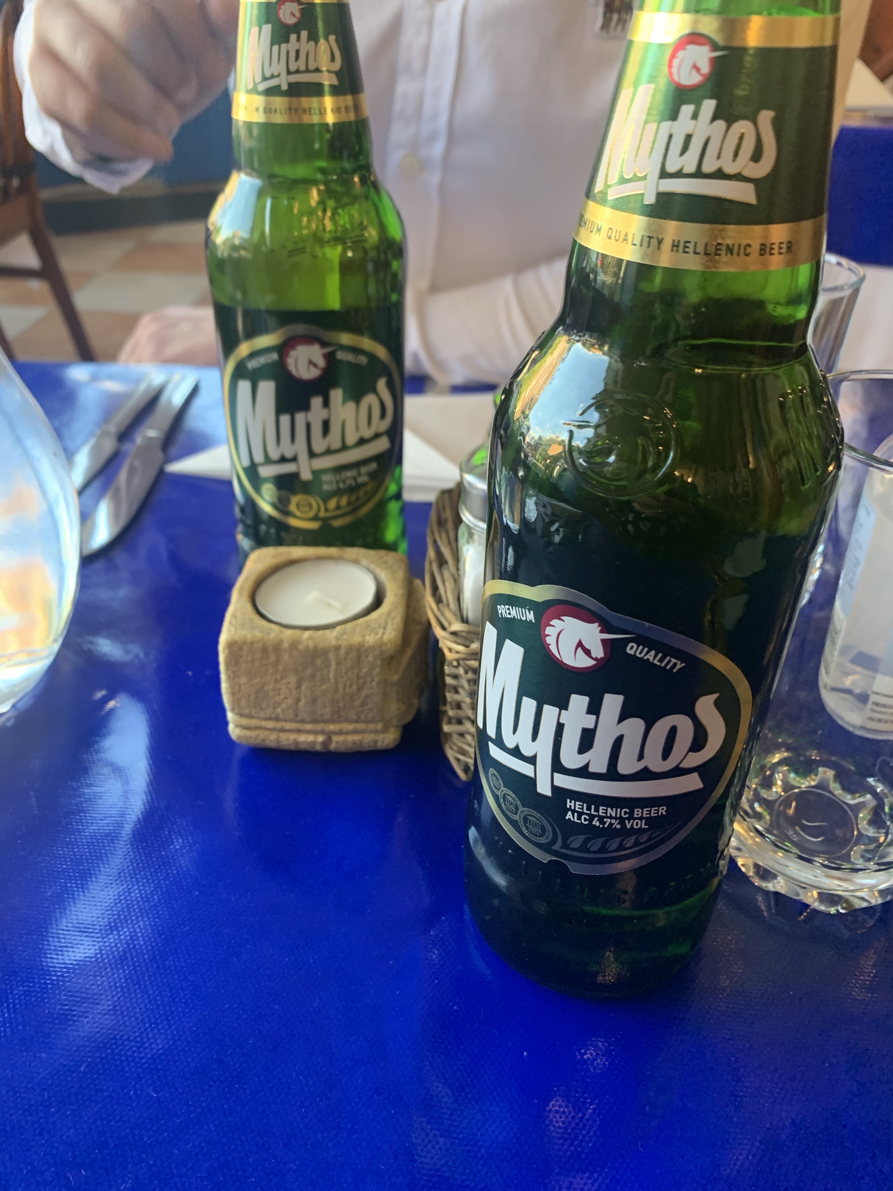 Starting the meal with a Mythos (had to be done), we ordered a Meze for 2 to share as our starter. We really enjoyed this as it included lots of bits to pick at and share and dip your pitta bread into. This was a very filling starter just to warn you. It included a selection of Tzatziki, Taramosalata , Houmous, Melitzanosalata (Aubergine dip), Spanakopita (feta + spinach pastry), Tiropita (feta + Béchamel sauce pastry) , Beans in a tomato sauce and Sarma (vine leaves stuffed with rice). Served with pitta bread.