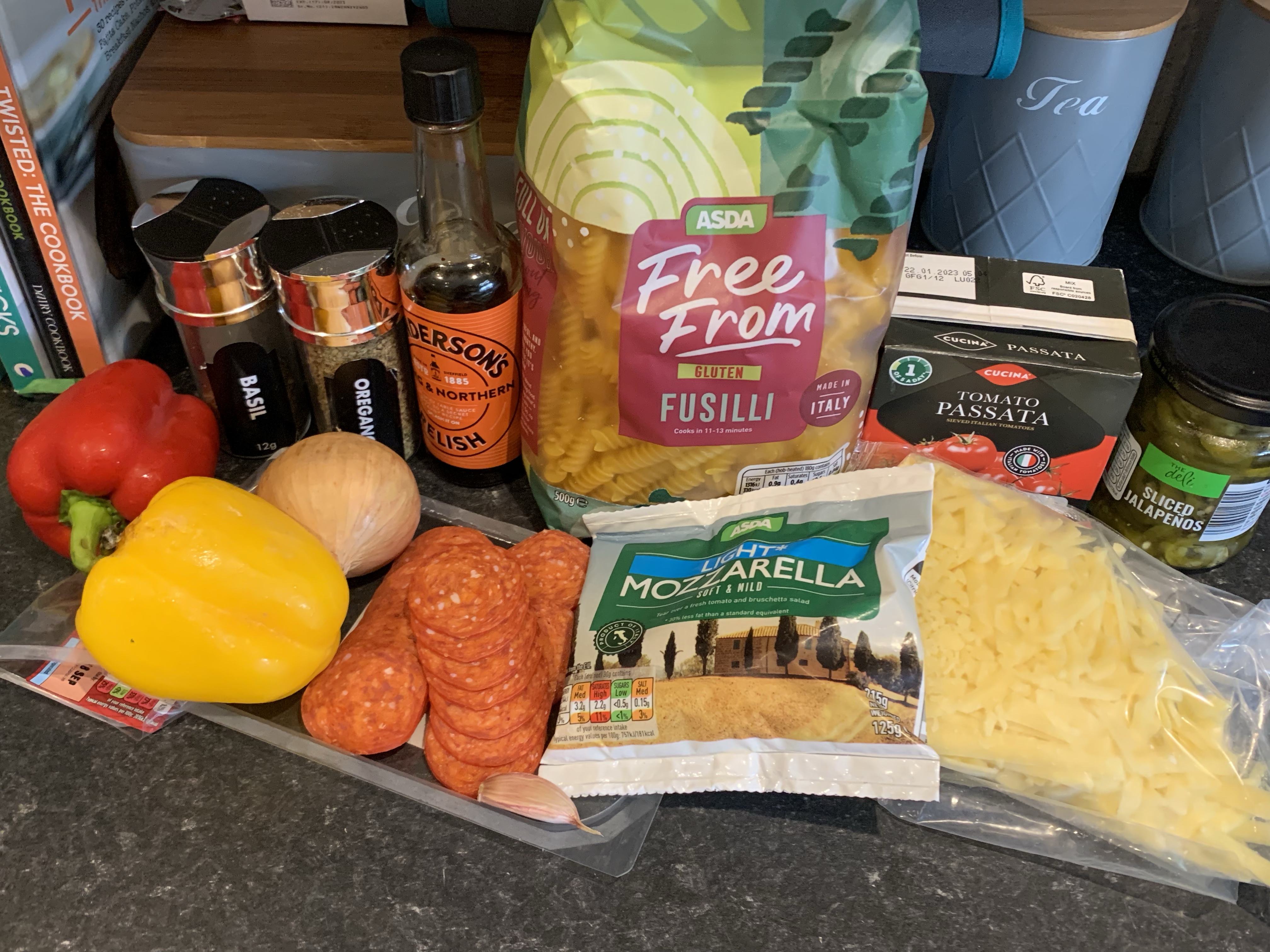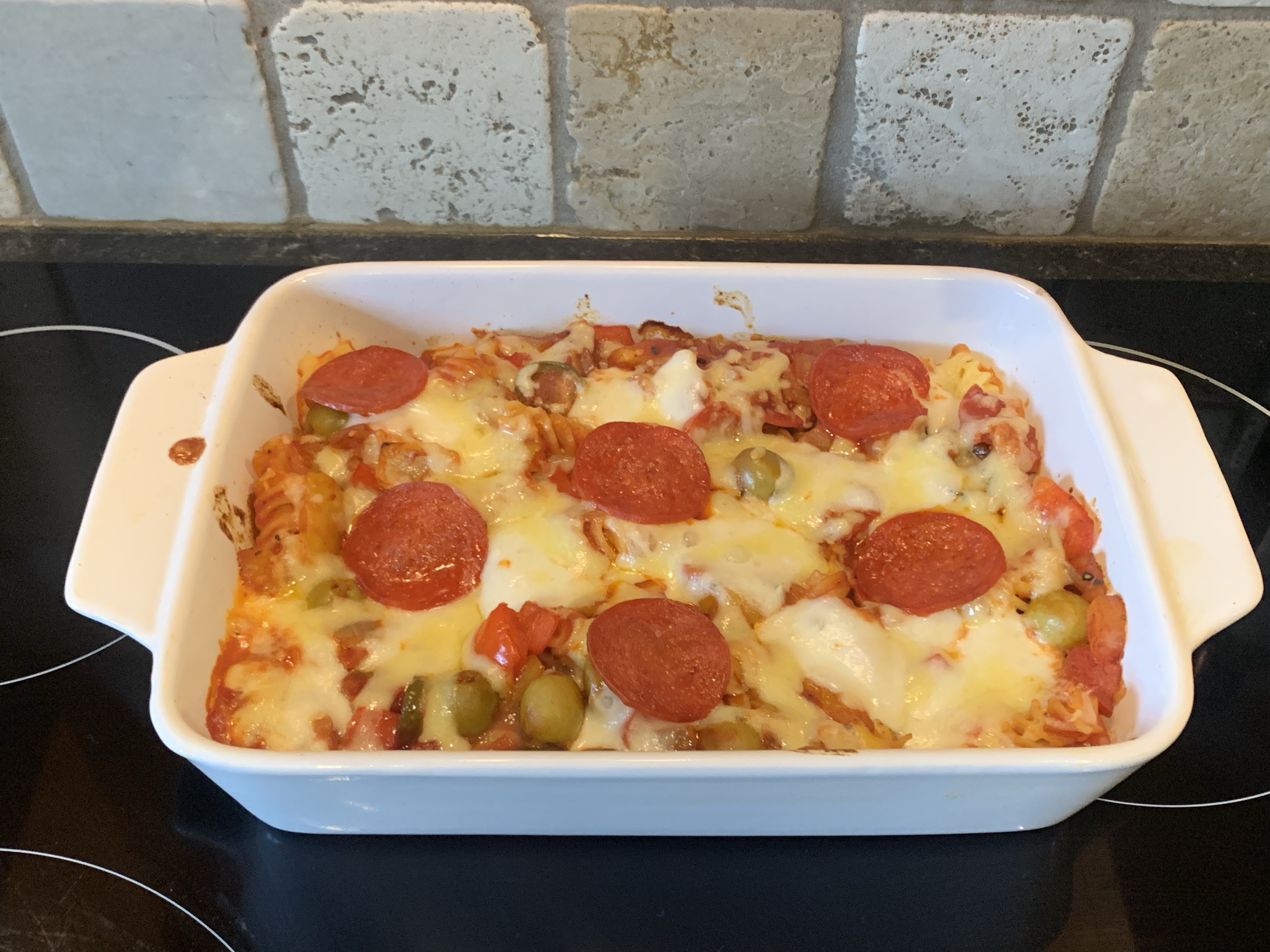- Tip the cooked pasta into an ovenproof dish, pour over the sauce and stir until the pasta is coated. Sprinkle the pasta with the mozzarella and cheddar and top with the remaining pepperoni.