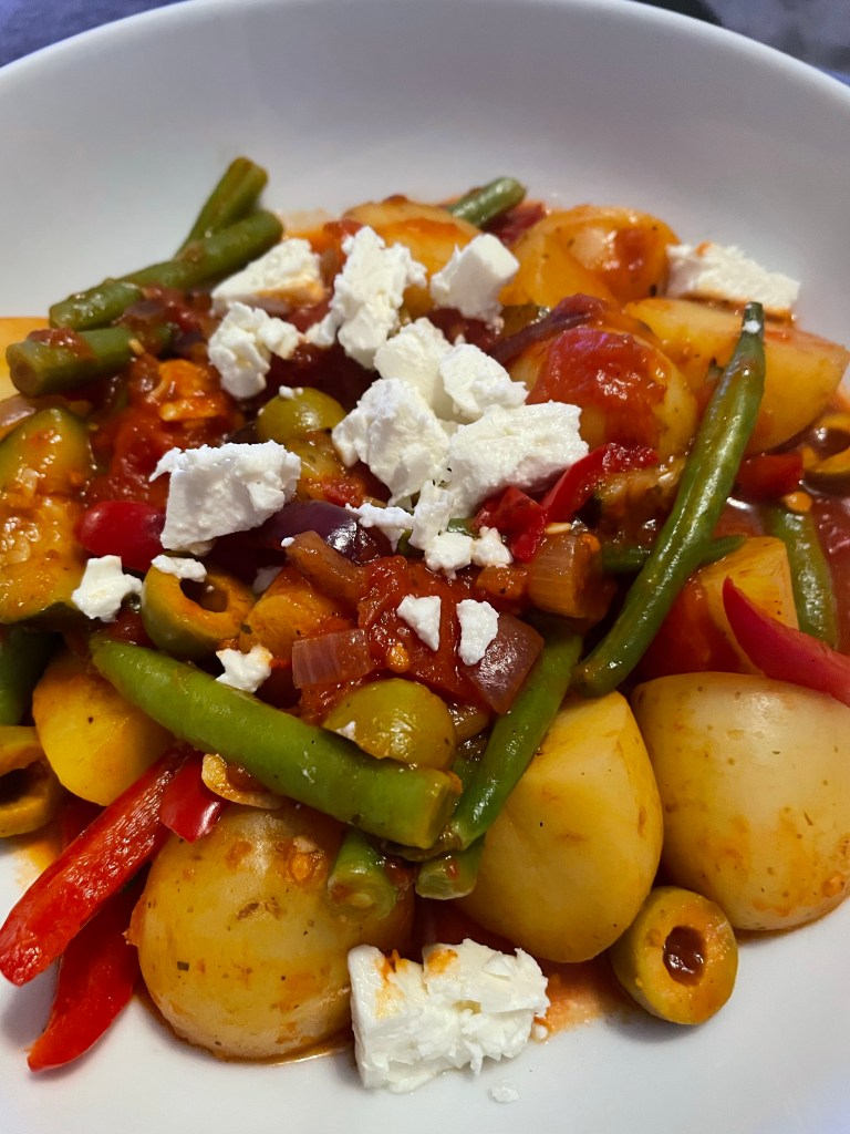 Greek Potato Stew (Stews & Soups) 215 calories – A stunning, meat free meal! I doubled the ingredients for an evening meal (still only 430 calories which is amazing) and had some leftover green beans from the Lamb Curry above so shoved them in too!