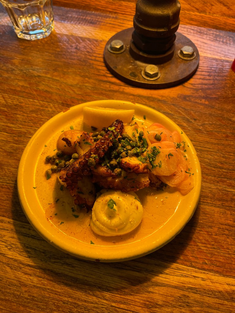 Chargrilled octopus, new potatoes, capers, shallots and aioli – The first time Ben has tried Octopus and he was pleasantly surprised. The dish was fresh and the octopus cooked well so that it was meaty, with a great tang from the capers and dressing.