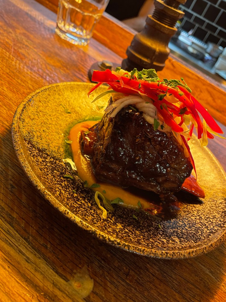 Beef short rib with ginger glaze and sweet potato purée . – ONE OF THE BEST DISHES I’VE EVER TASTED!! We were both just in awe eating this with sounds of pure joy escaping uncontrollably lol. The rib meat just melted and fell off the bone, the flavours were perfect. You must try this at least once in your life in my opinion.