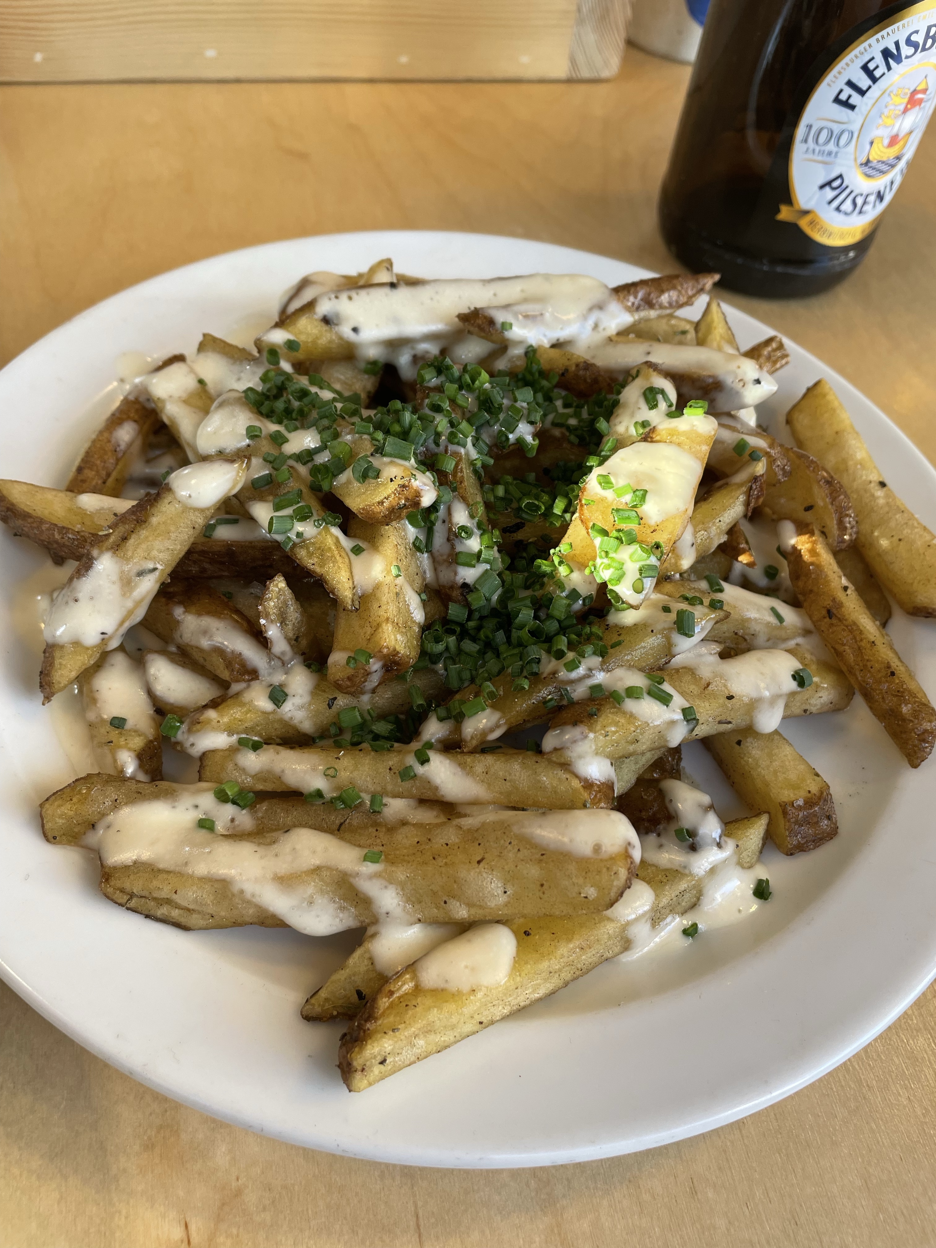 - Brunswick Chips £4.50 (v,gf) – Hand Cut Double Cooked Chips, Aioli, Chives, Brunny Salt – These weren’t bad, the Alioli was VERY garlicky and tasted a bit floury to me. I would definitely recommend sharing the portions of chips over ordering one each.