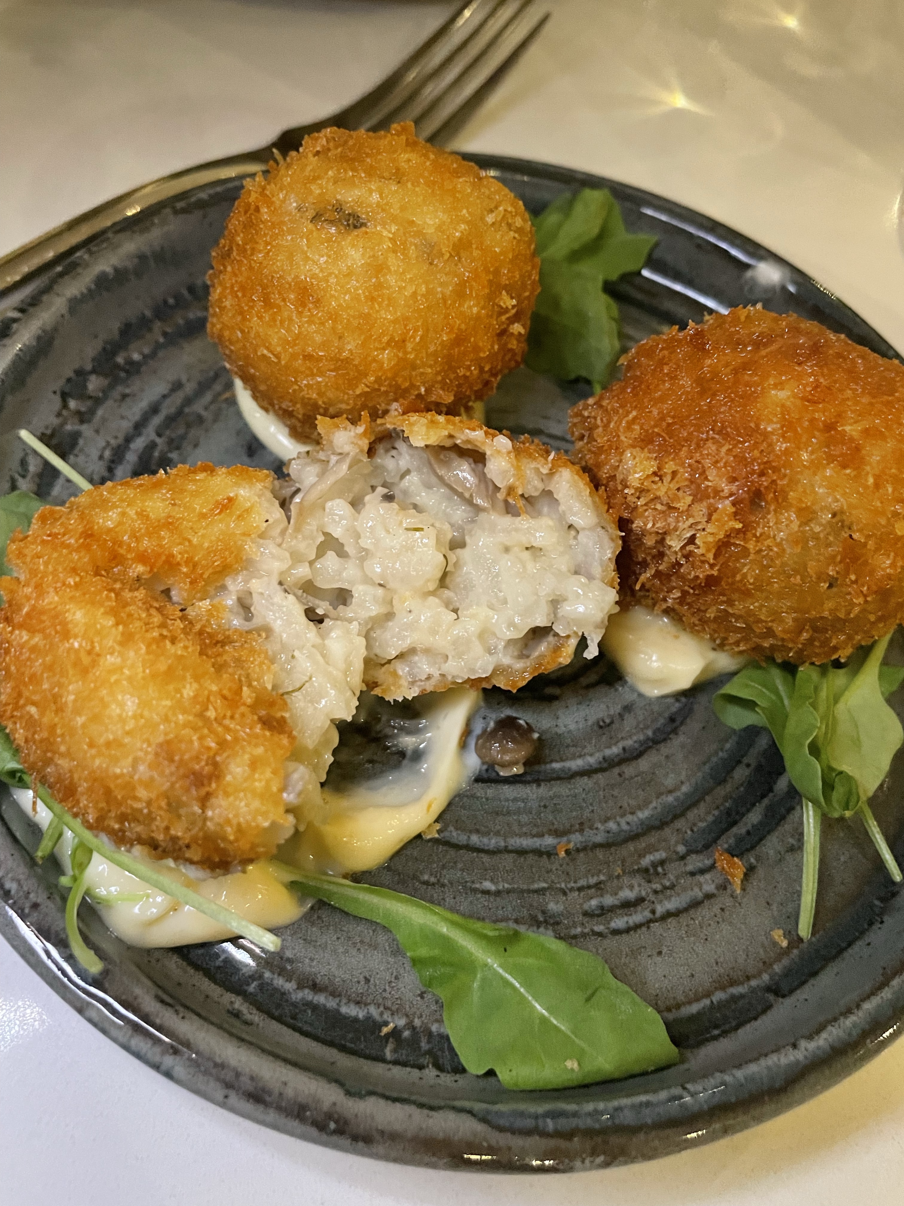 - Truffled mushroom arancini served with truffle aioli and chives (v) £9 – these were seriously comforting and creamy!