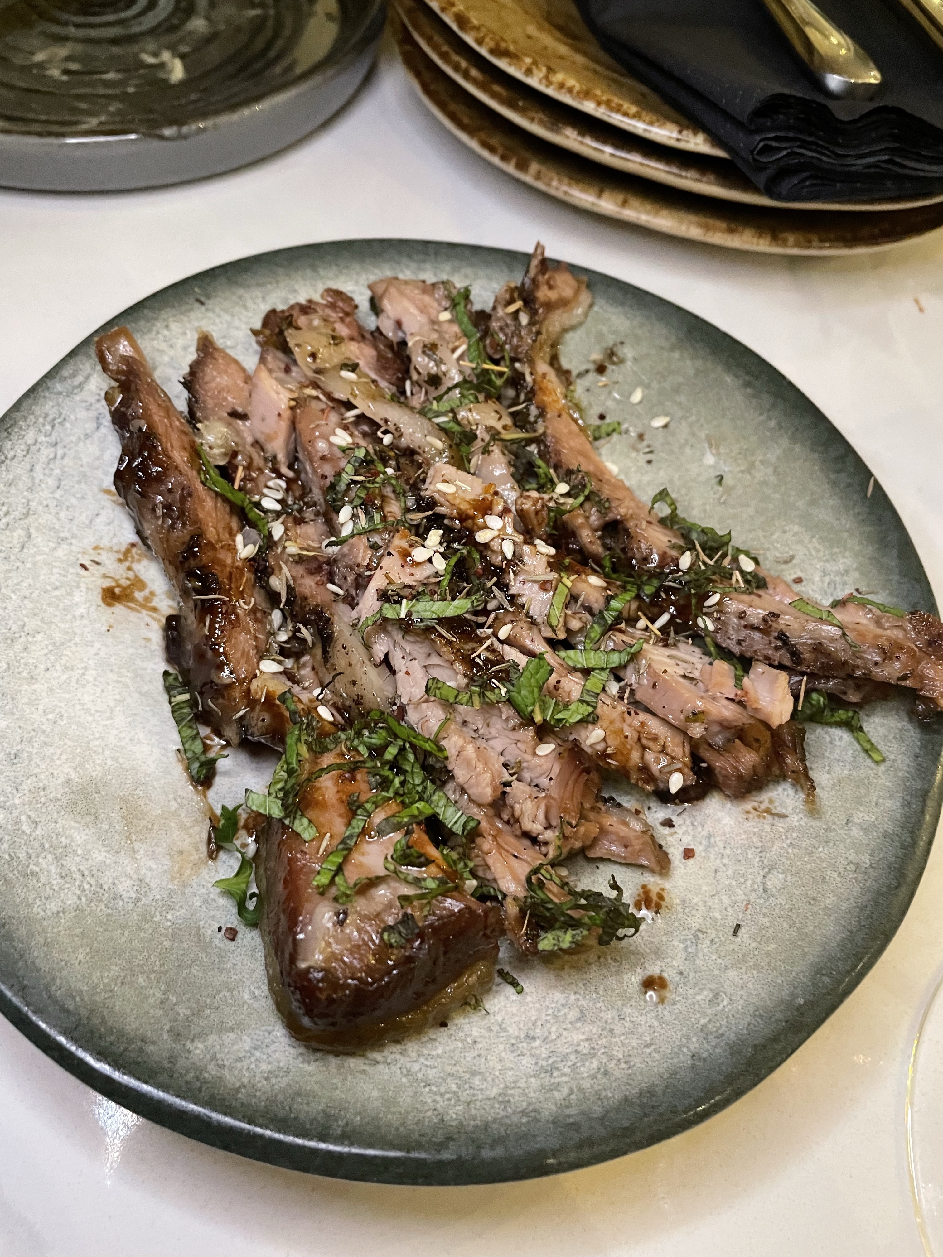 - Pressed slow cooked lamb breast served with prune & red wine reduction, mint and xa’atar (gf) £12 – a taste sensation and melted in the mouth