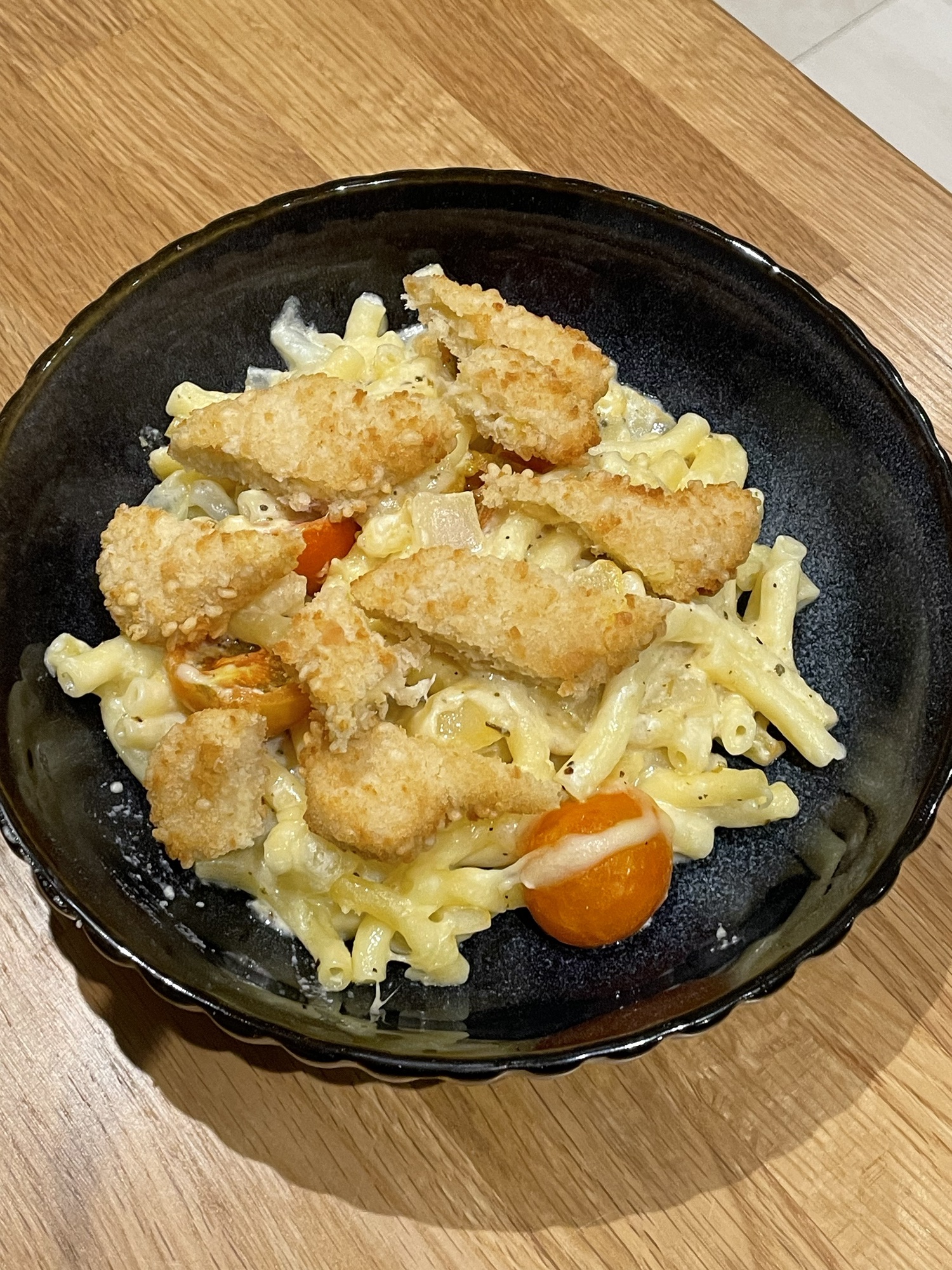 - Crispy Chik’n Fillets with a hint of cheese – we thoroughly enjoyed these made in the air fryer and served on top of homemade Mac & cheese with tomatoes.