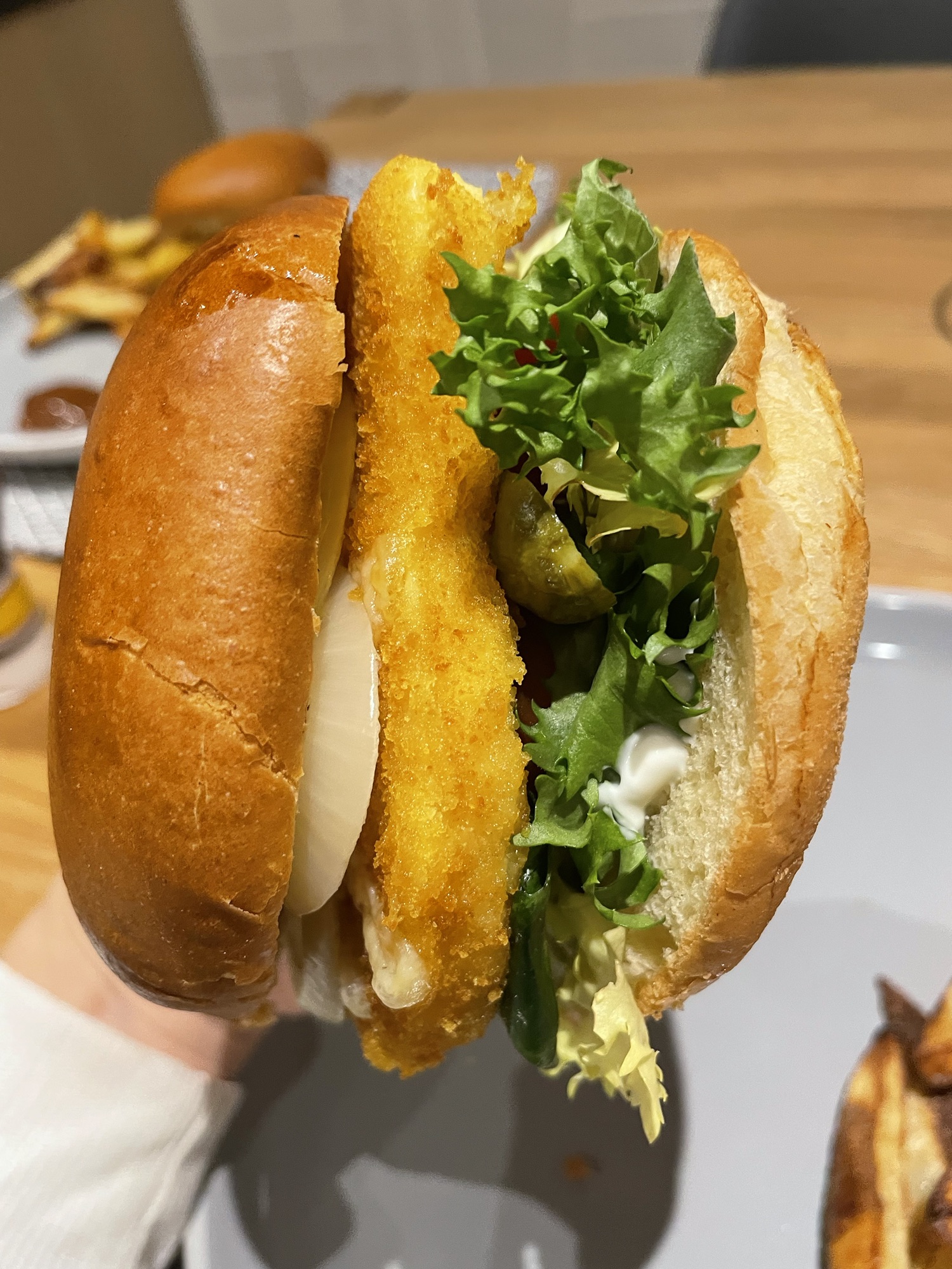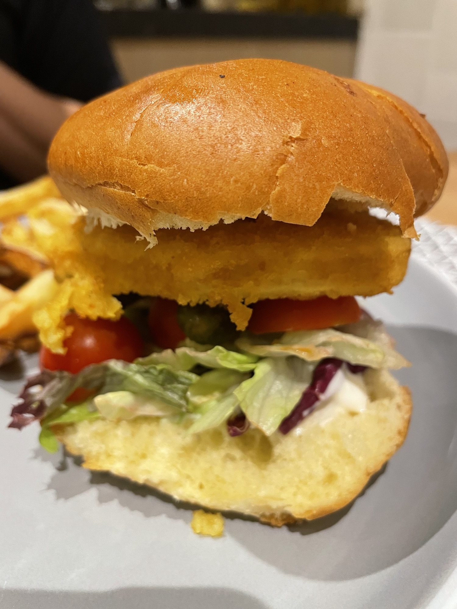 - Crispy Chik’n Fillet Burger – we had these with homemade chips served in a brioche bun with grated cheese, lettuce, onion and tomato, delicious.