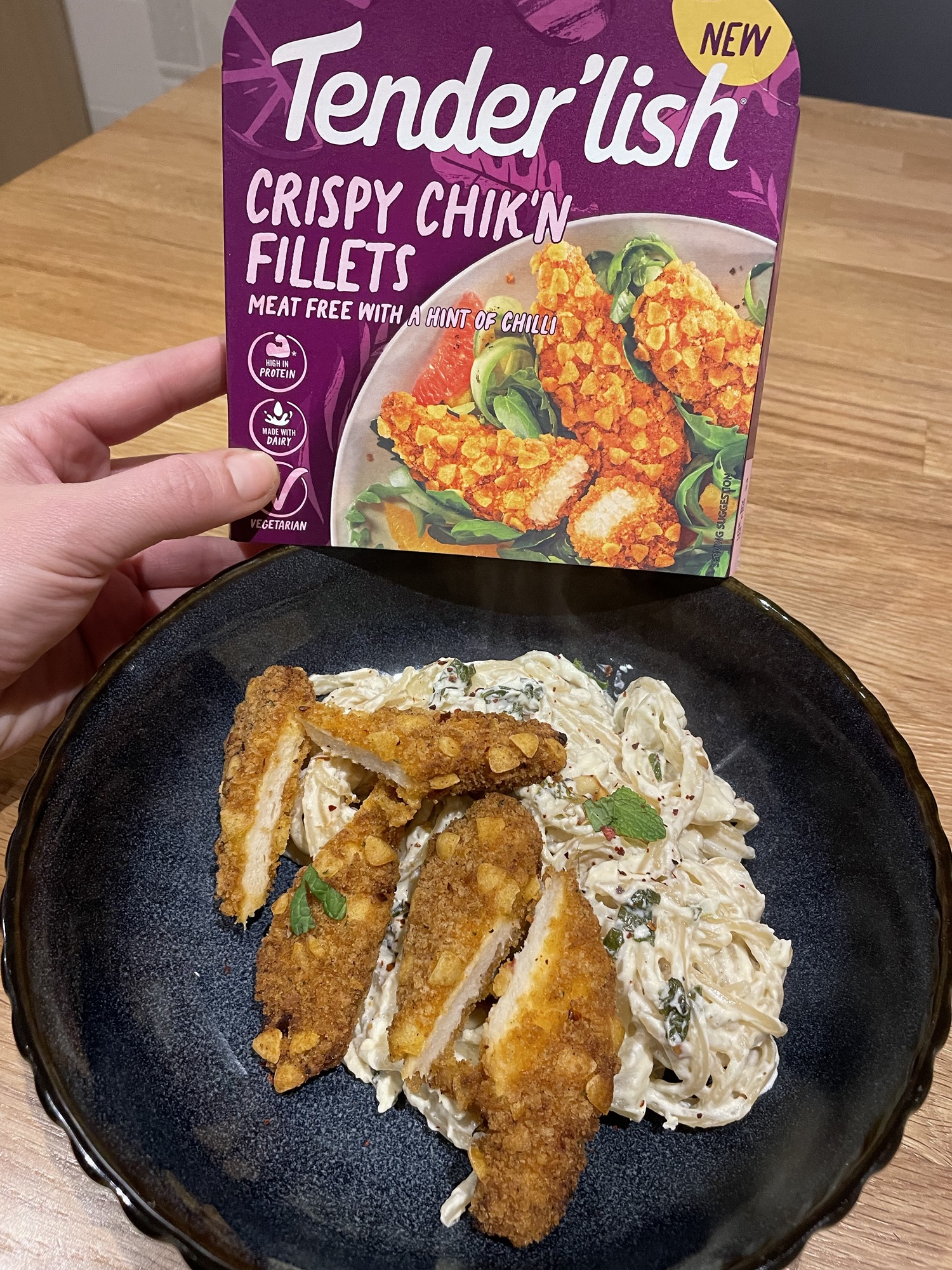 - Crispy Chik’n Fillets – Fabulous with a hint of chilli with Lemon, Feta & Mint spaghetti on the side!