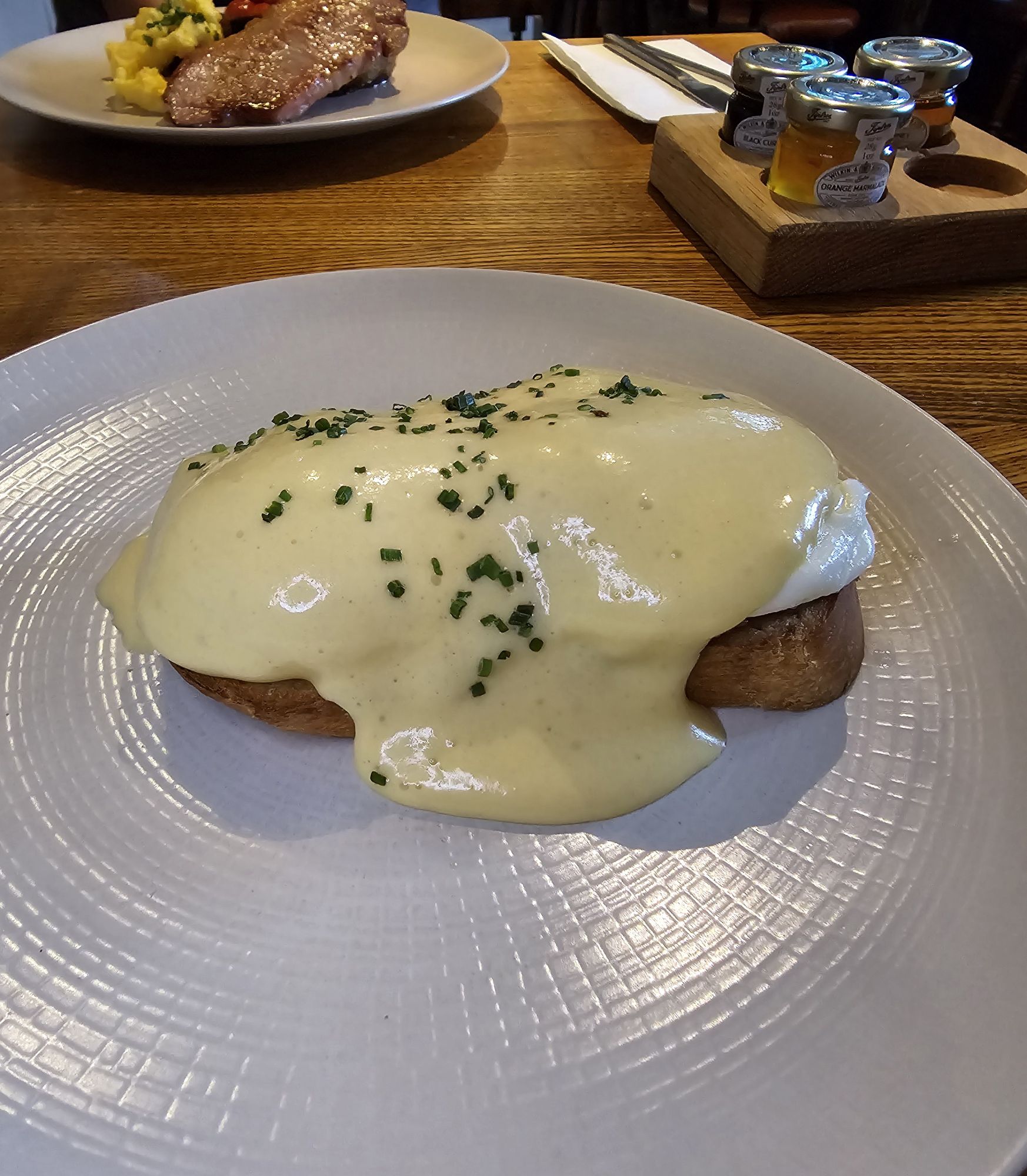 - Eggs Benedict (ÂŁ14.00); 2 poached free range eggs with smoked bacon and homemade Hollandaise sauce on toasted Brioche – the yolk pop says it all, the eggs were for me pure perfection.