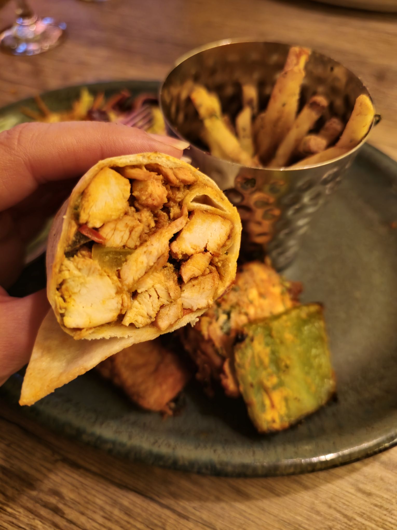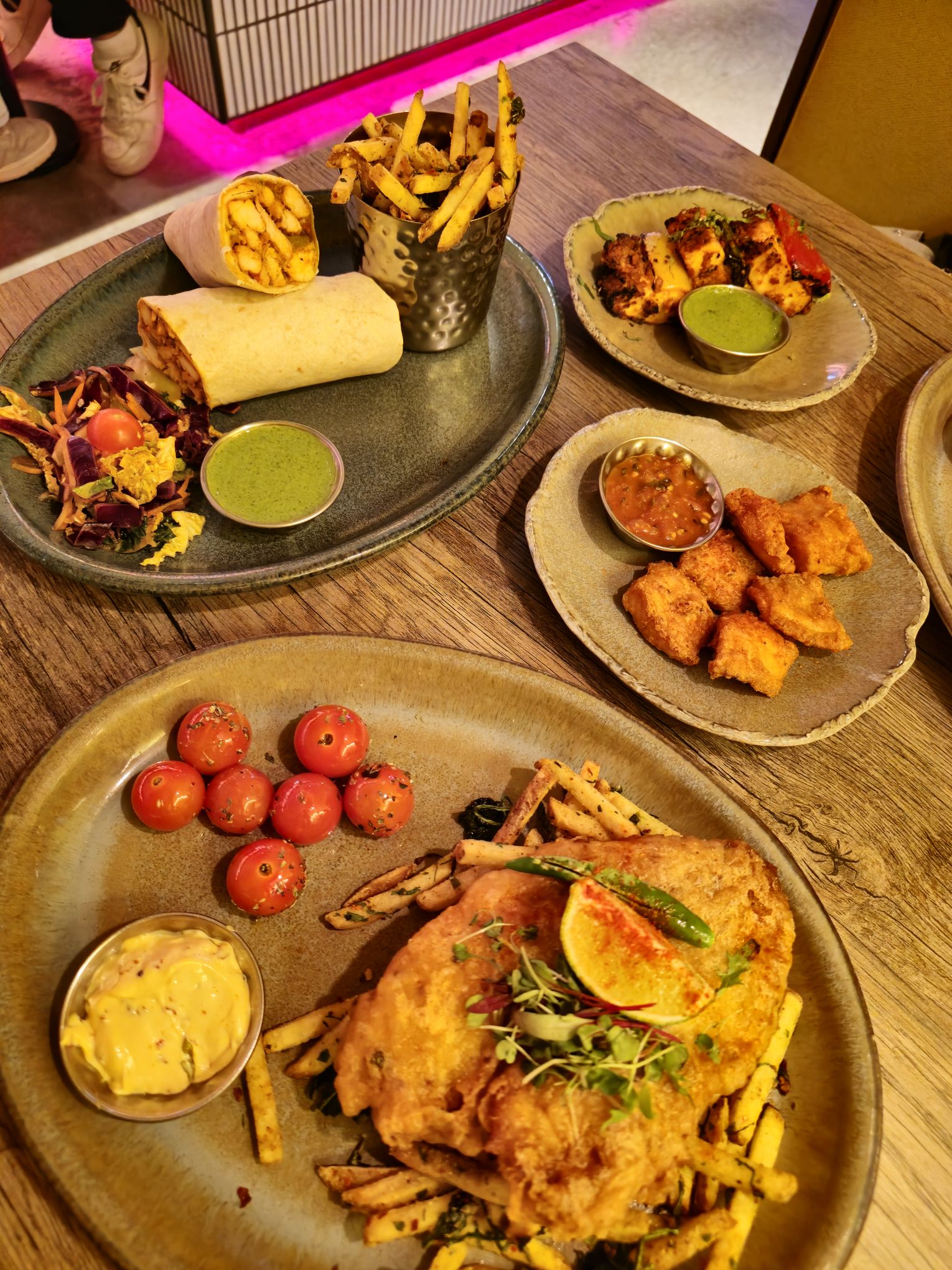 The service initially started off slow but then got into full swing, drinks were flowing and the food we had was great. I went with the chicken kathi roll and shared this with Alisha who got 2 small plates; gunpowder paneer & amritsari fish fry. So we were VERY full, but enjoyed it all! There was a nice spice to the plates.