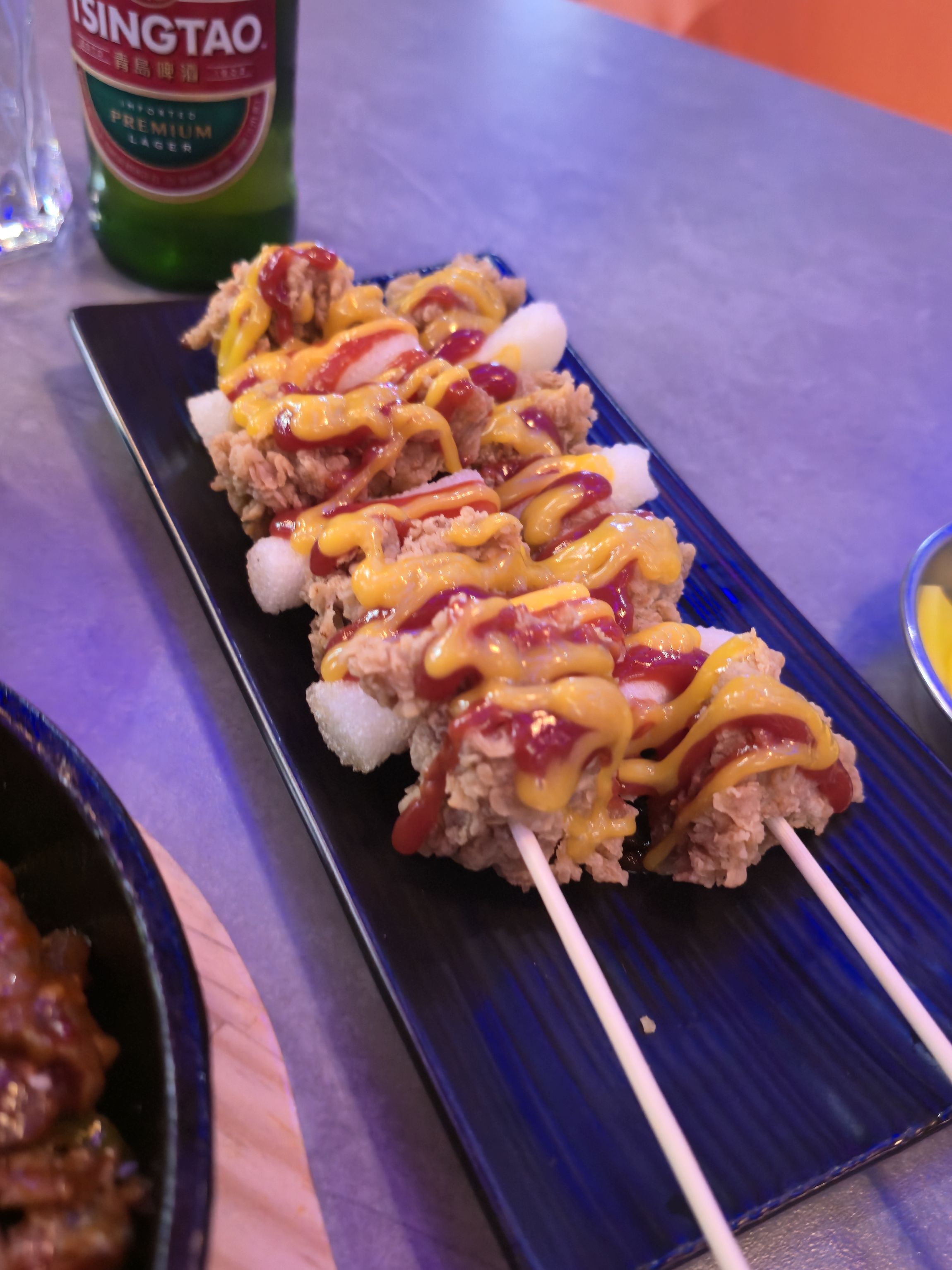- Fried chicken and tteokbokki (Korean rice cakes) skewers – the rice cakes were intersting… they look like little polystyrene tubes haha, but they are quite nice stodgy things that soak up the sauce. A lovely dside dish.