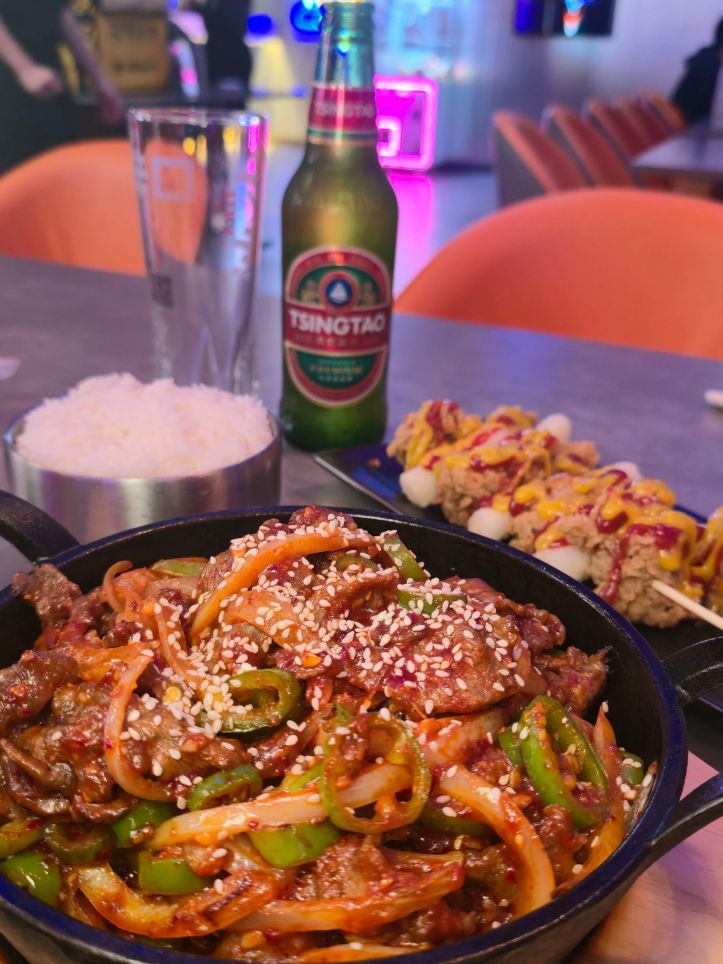 - Sogogi Bokkeum (a spicy stir fry with slices of tender beef, onions, peppers and chillies) and steamed rice. This was very tasty and had a great kick to it and lots of garlic which I love!
