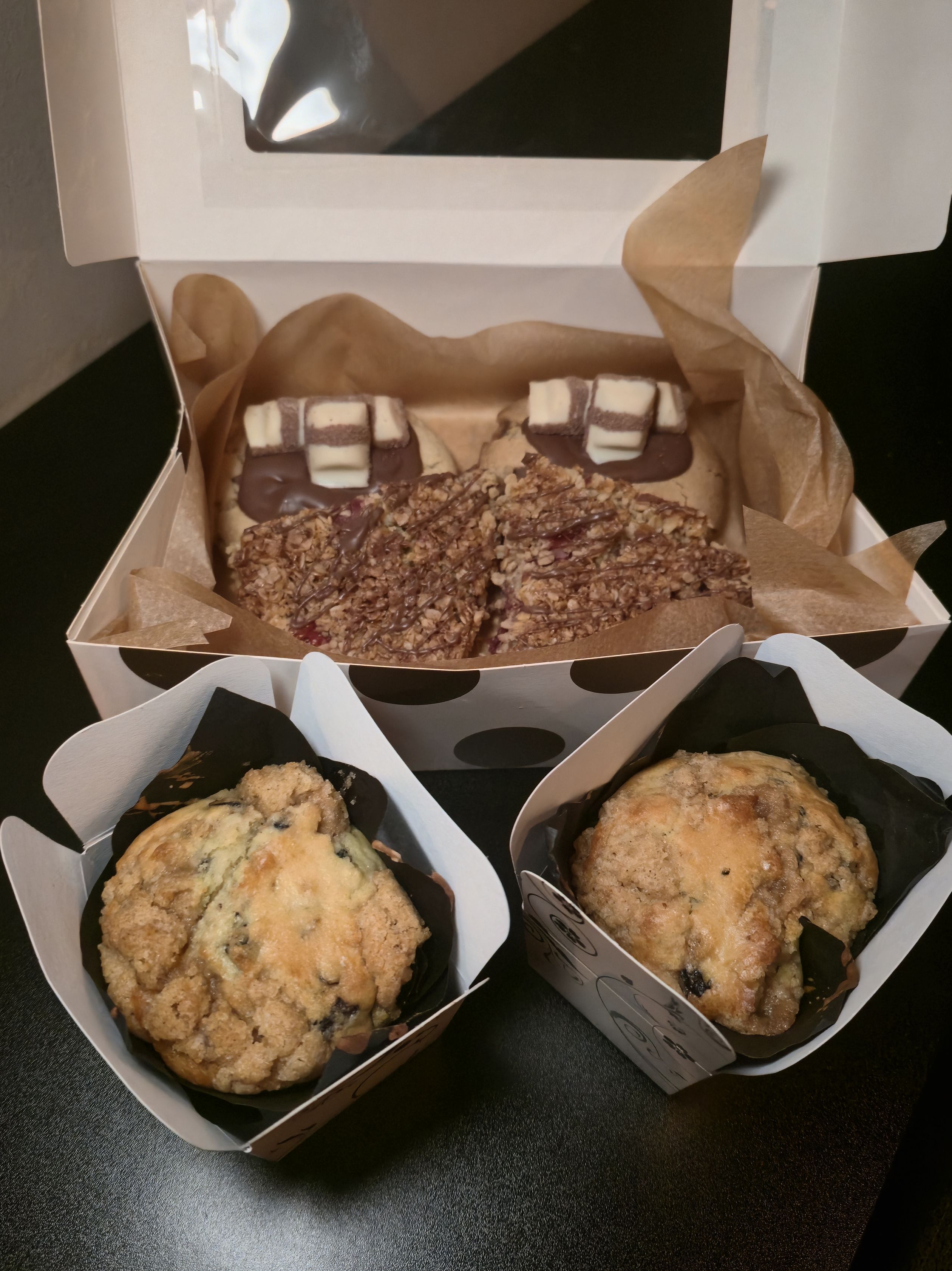 We tried; Strawberry flapjack, Kinder Bueno cookie, blueberry crumble muffins and a slice of Lotus Biscoff milk cake 🤤👌🏼
