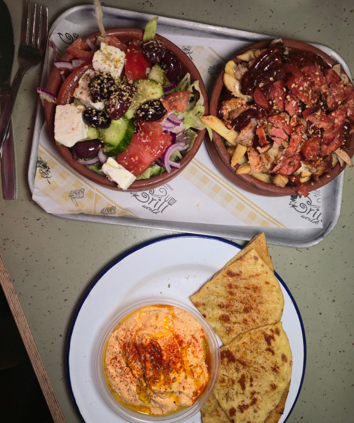 I thought I’d be “good” and just choose a few sides… well they were a feast in themselves, BUT they were delicious and exactly what I fancied. I went for; Greek salad, Mythos Meaty Fries (fries loaded with Greek sausage, chicken gyros, bbq sauce, legendary Gods sauce) and Greek pita with Tyrokafteri (a spiced pepper & feta dip).