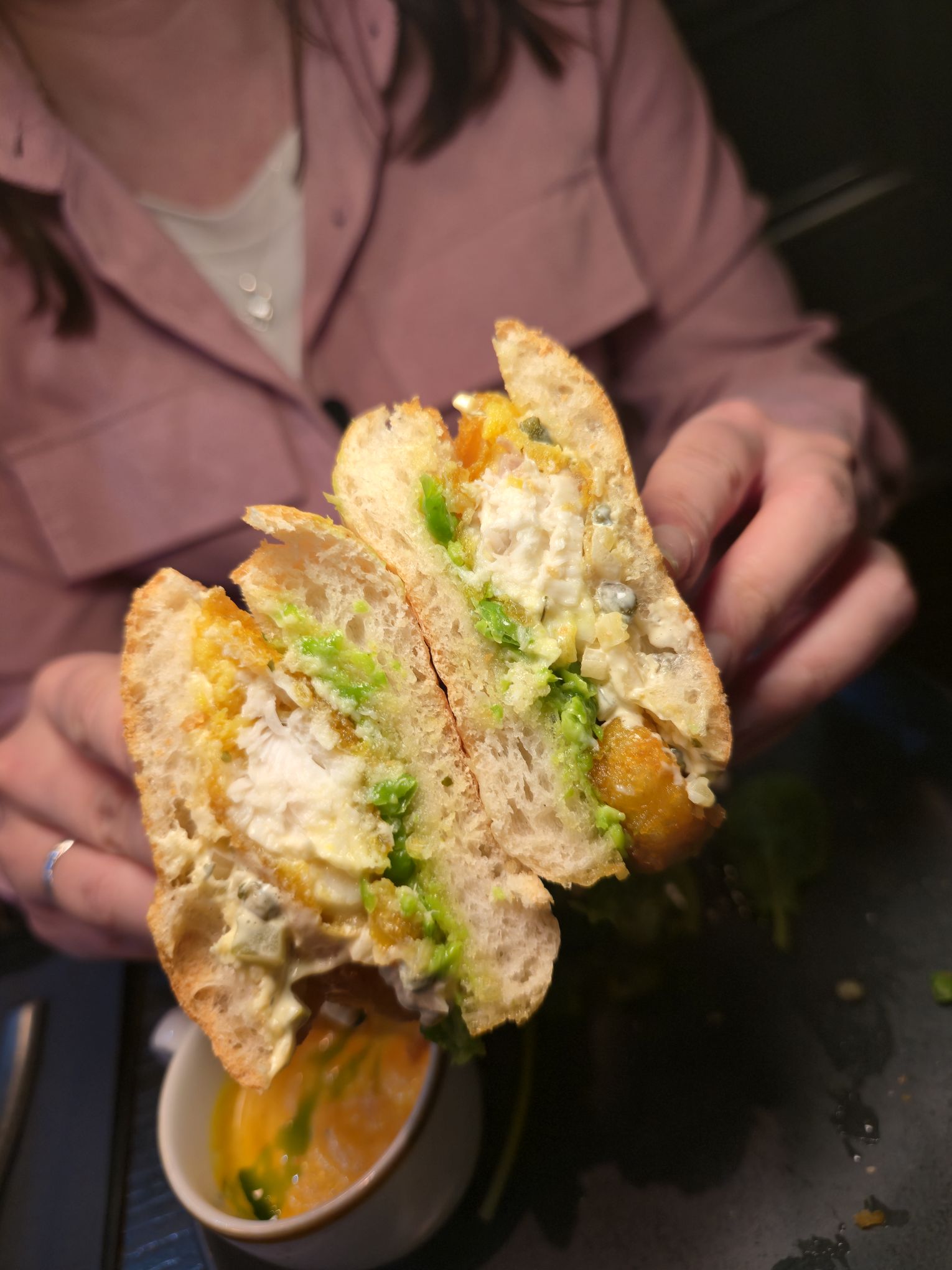 - Fish Finger Sandwich, with tartare sauce, crushed peas & a carrot and coriander soup