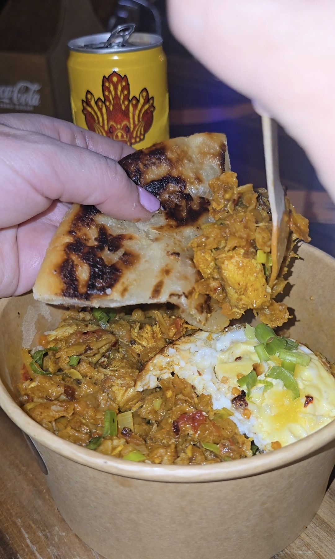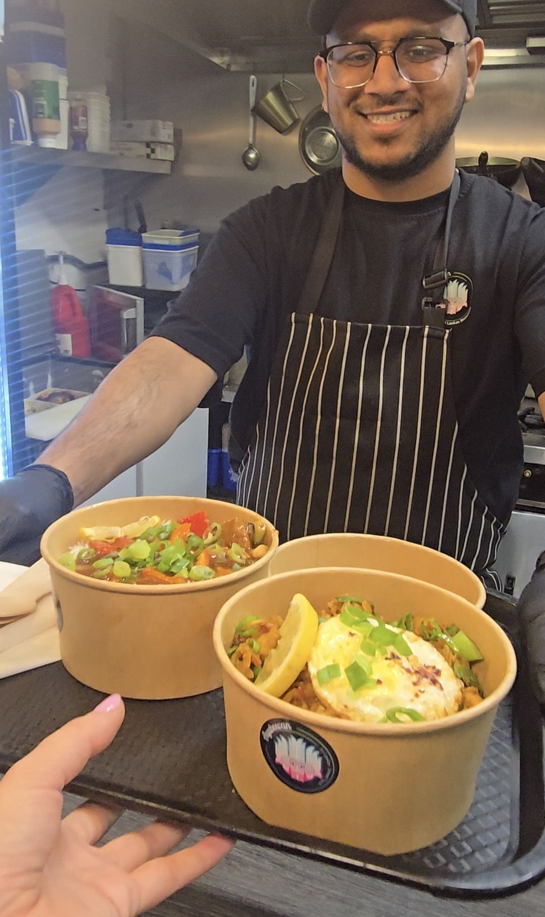 - Chicken Kothtu – a Sri Lanken street food market favourite. Shredded godamba roti stir fried with onion, garlic, carrot, medium spices & curry leaves, served with a fried egg on top. Choose from meat, prawn or jackfruit.